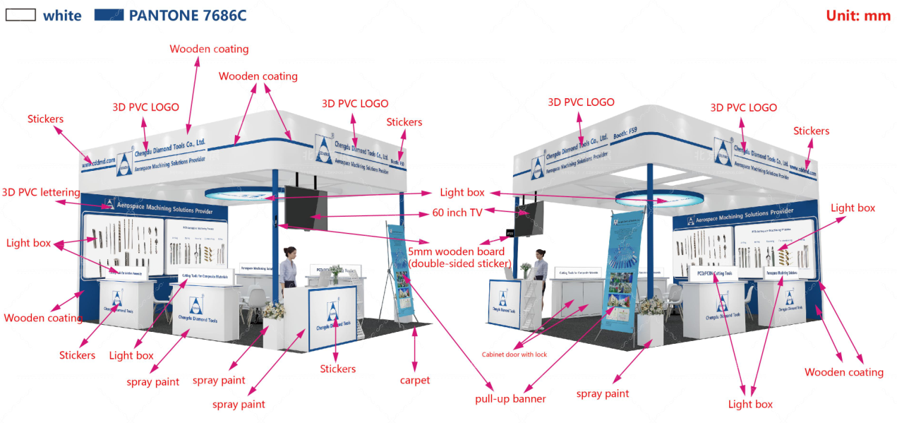 项目中通过材料分类:包含木质涂料展台搭建,木质banner展台搭建,铝型材绷布搭建。